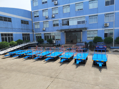 3吨无动力牵引平板拖车前后可拆护栏南工车辆非标订制,平板拖车无动力,可用叉车、牵引车牵引,适用于工厂、码头、港口、仓库等场区内大宗货物的短途周转运输。 载重大,成本低。可多台连续牵引。