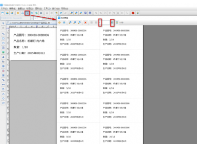 7. 制作完成之后,点击软件顶部工具栏中的“打印预览”按钮,翻页查看批量生成的产品标签,预览无误就可以直接连接打印机打印出来了。